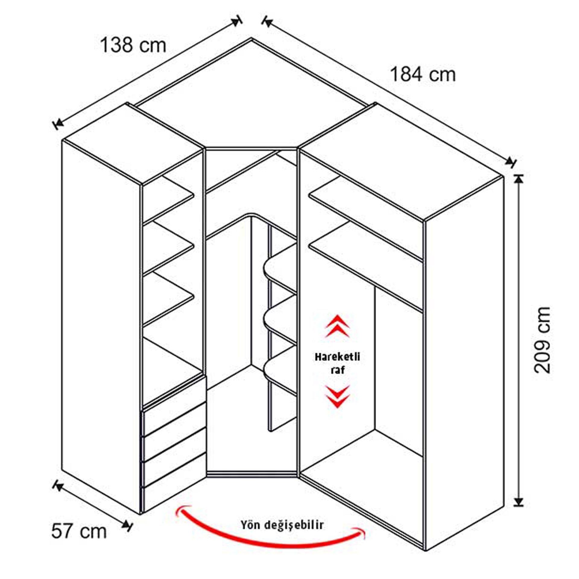 Genişlik: 184 cm | Derinlik: 138 cm | Yükseklik: 209 cm