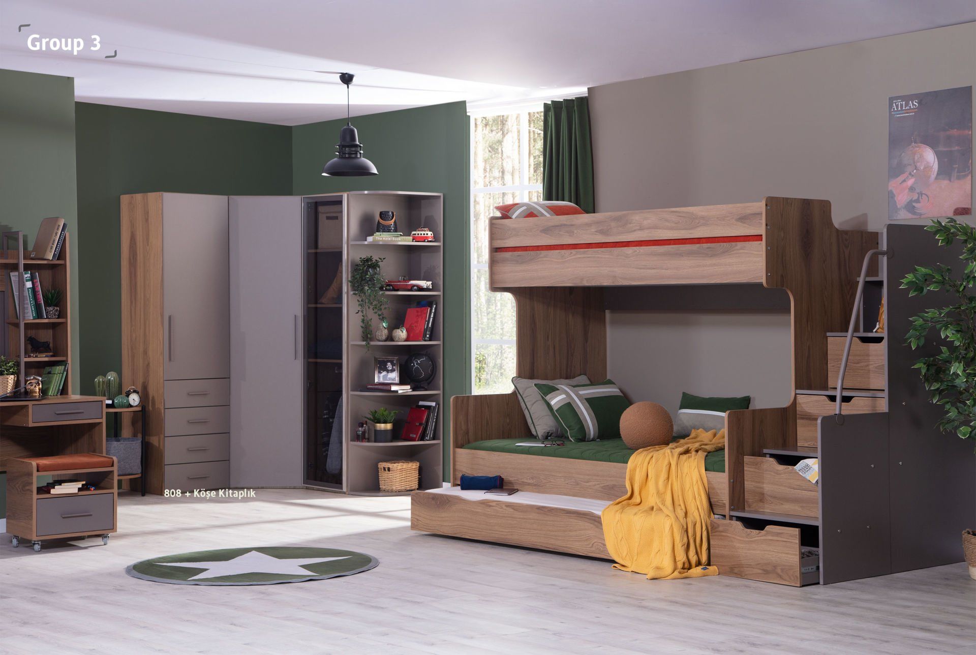 3 Kapılı Köşe Dolap 808 + Köşe Kitaplık + Komodin + Çekmeceli Ranza + Altlık + Sehpa