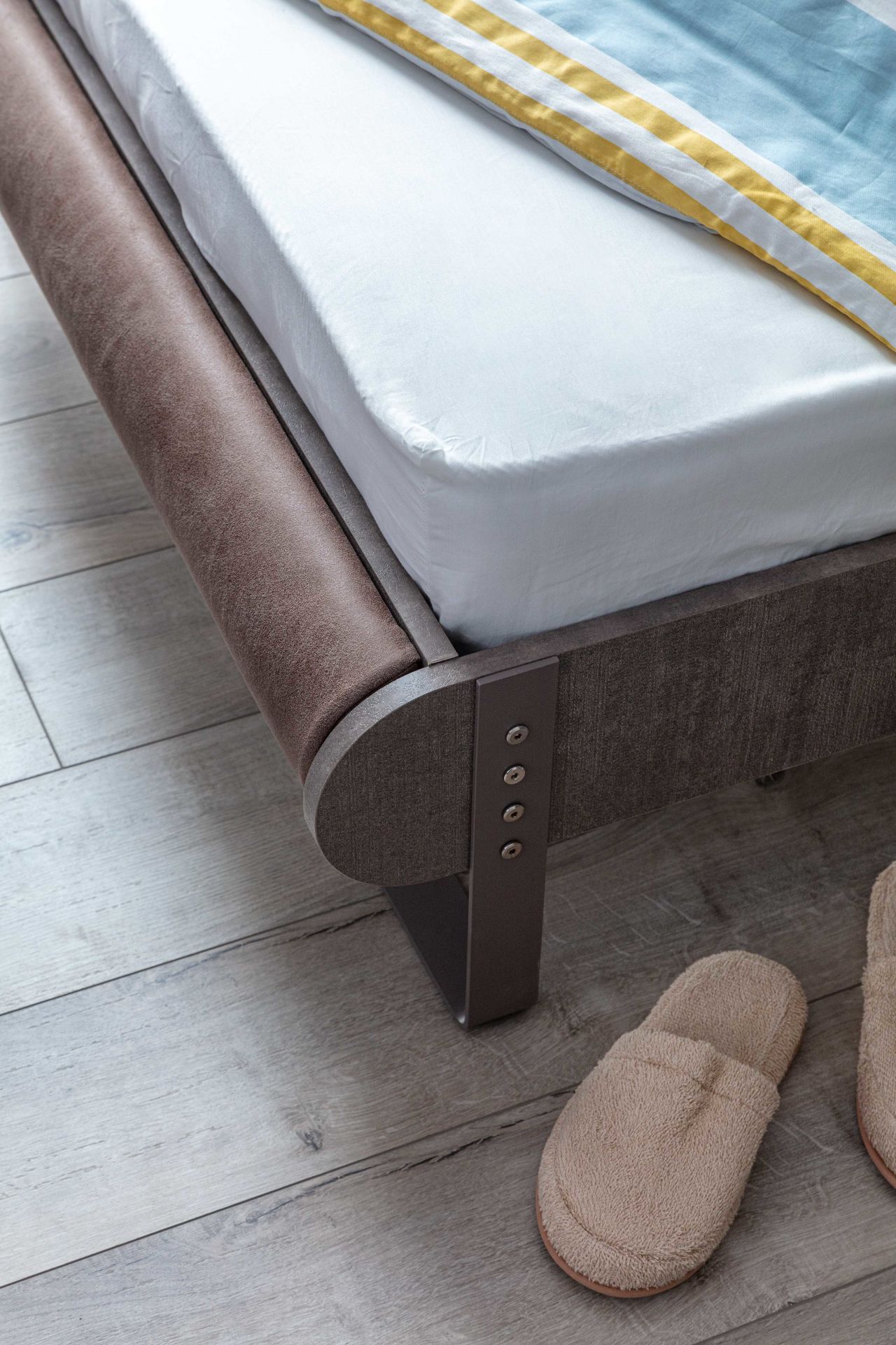 ·Karyola başucu ve ayakucu sünger üzerine bej ve kahverengi kumaş kaplamadır.