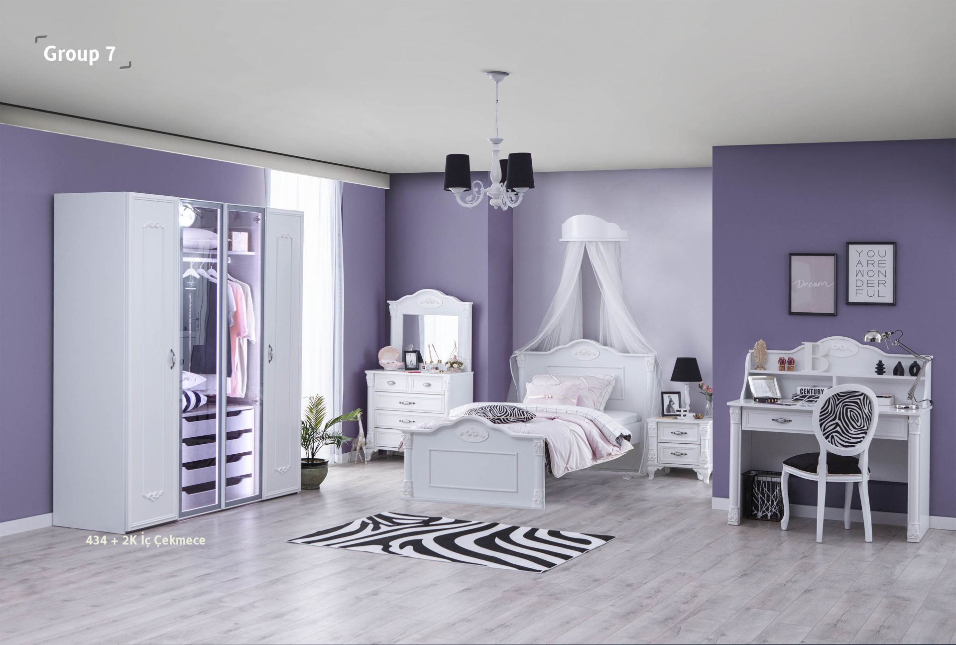 4 Kapılı Dolap + 100 x 200 Karyola + Komodin + Çalışma Masası + Ünite + Çamaşırlık + Ayna