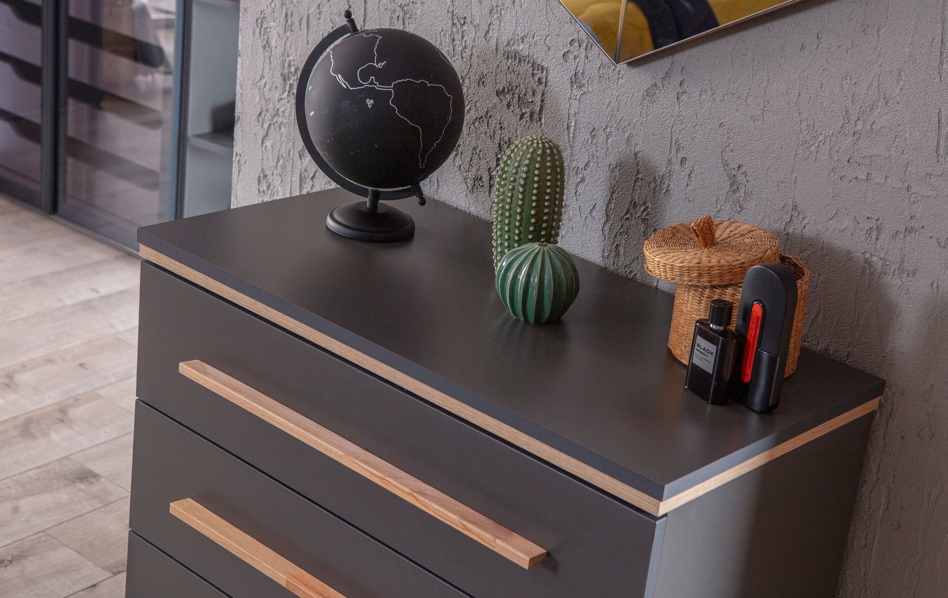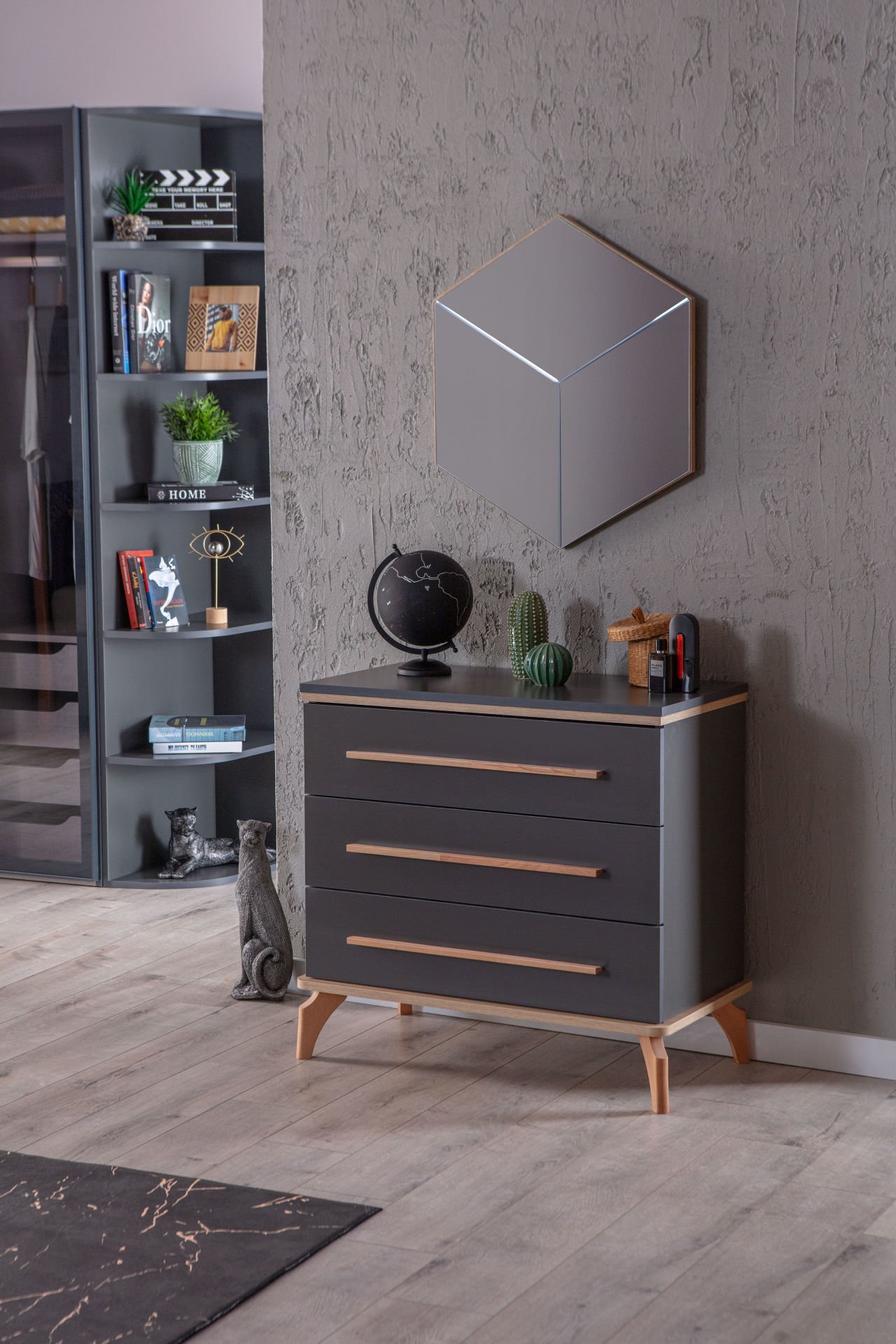 ·Ürün rengi antrasit gri ve ahşap desendir.