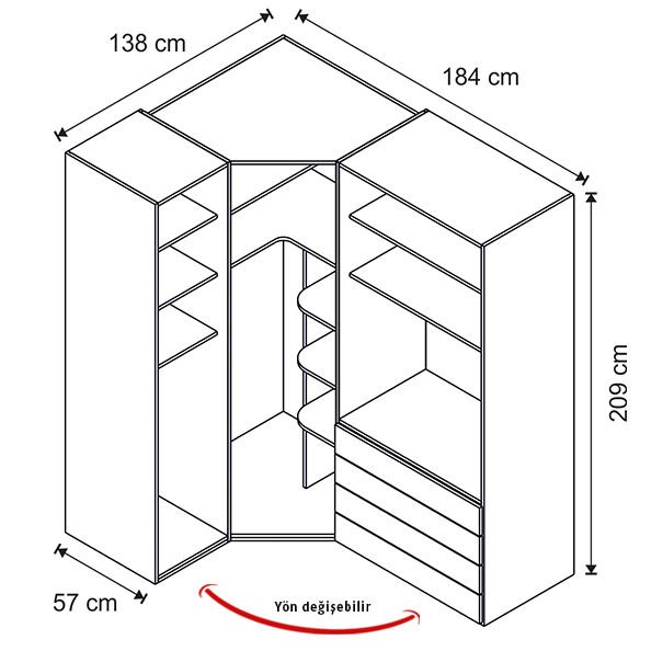 Köşe Dolap Ana Kabin + 1 Kapılı İlave Kabin (1 Adet) + 2 Kapılı İlave Kabin (1 Adet) + MDF Kapak (1 Adet) + Ayna Kapak (1 Adet) + 2 Kapak + Çekmeceleri