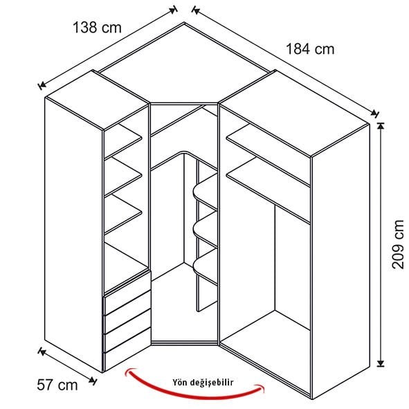 Köşe Dolap Ana Kabin + 1 Kapılı İlave Kabin (1 Adet) + 2 Kapılı İlave Kabin (1 Adet) + Yonga Levha Kapak (2 Adet) + Cam Kapak (1 Adet) + 1 Kapak + Çekmeceleri (1 Adet)