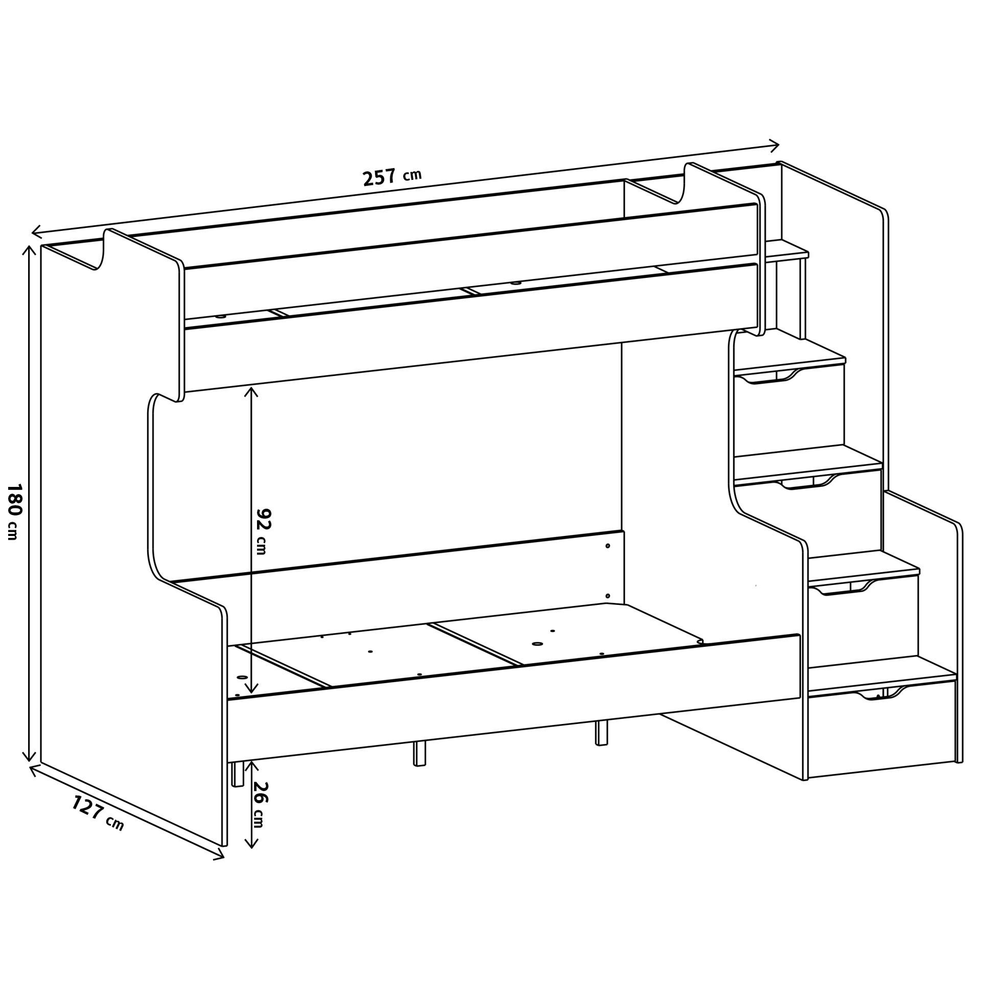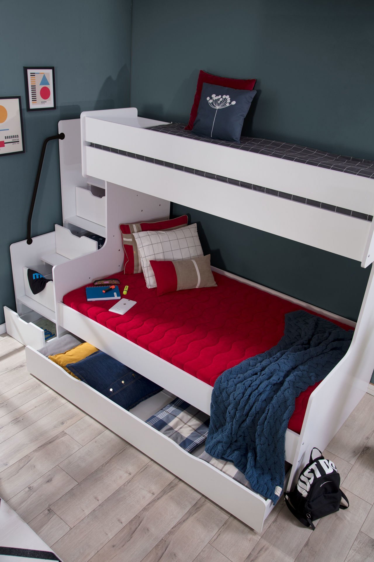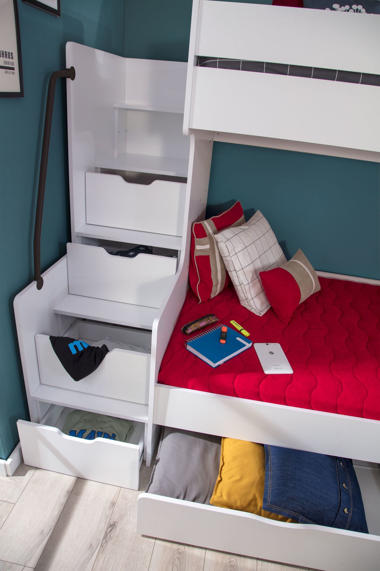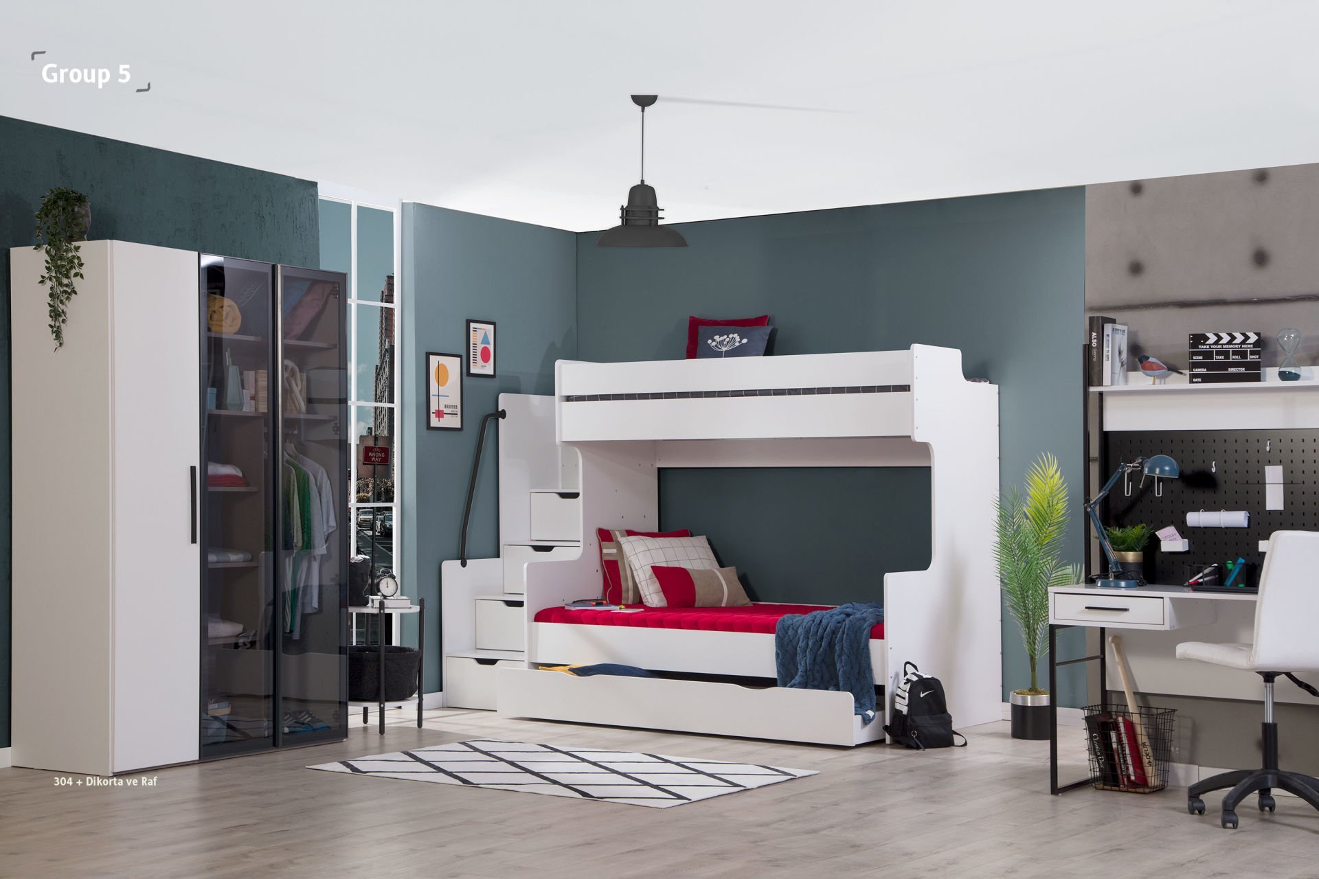 Aynı odayı paylaşan kardeşlerin rahatlığı için tasarlanan geniş ranza; üst yatak ölçüsü 90x200 cm, alt yatak ölçüsü 120x200 cm'dir. Atlas White takımında kullanılabilir.