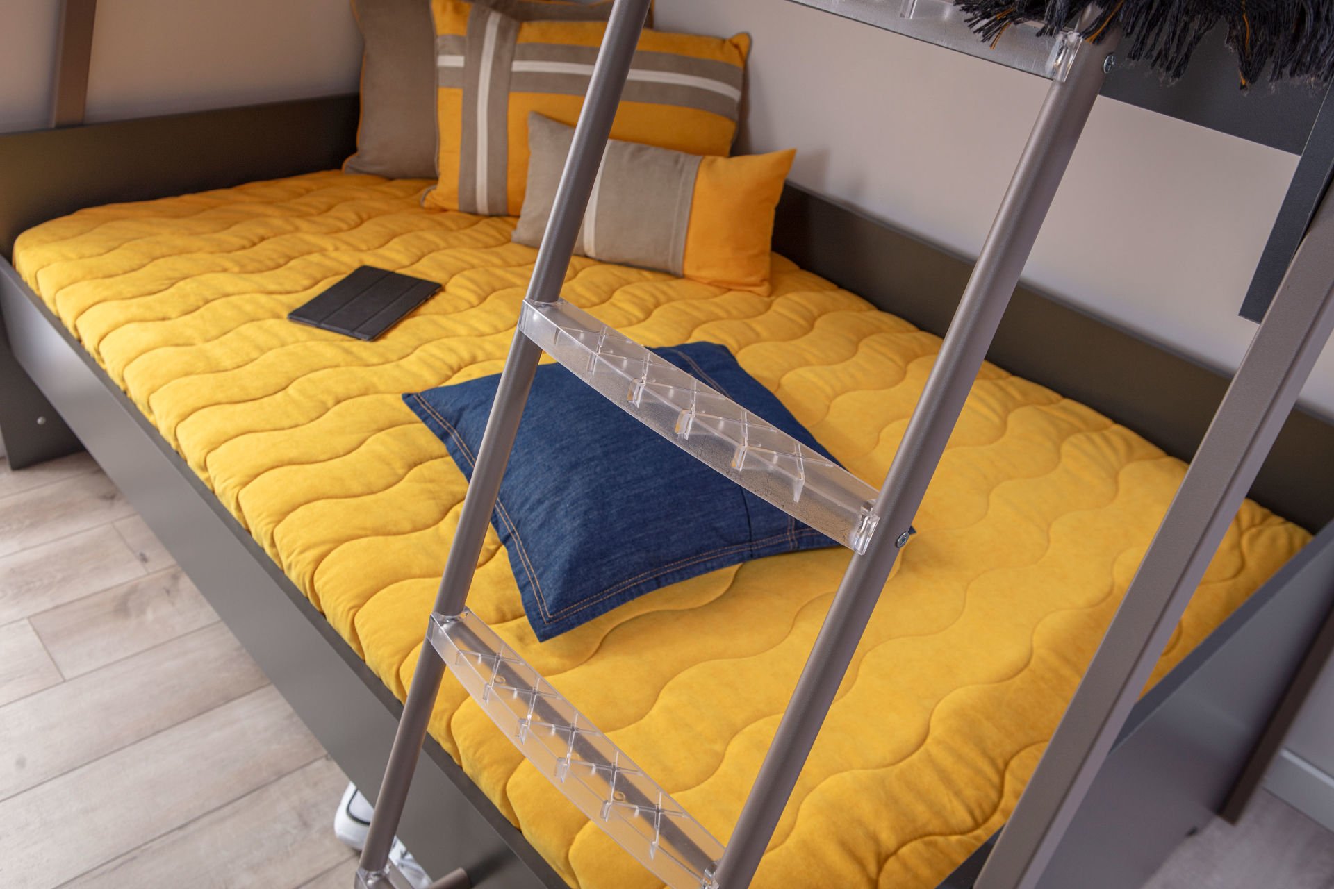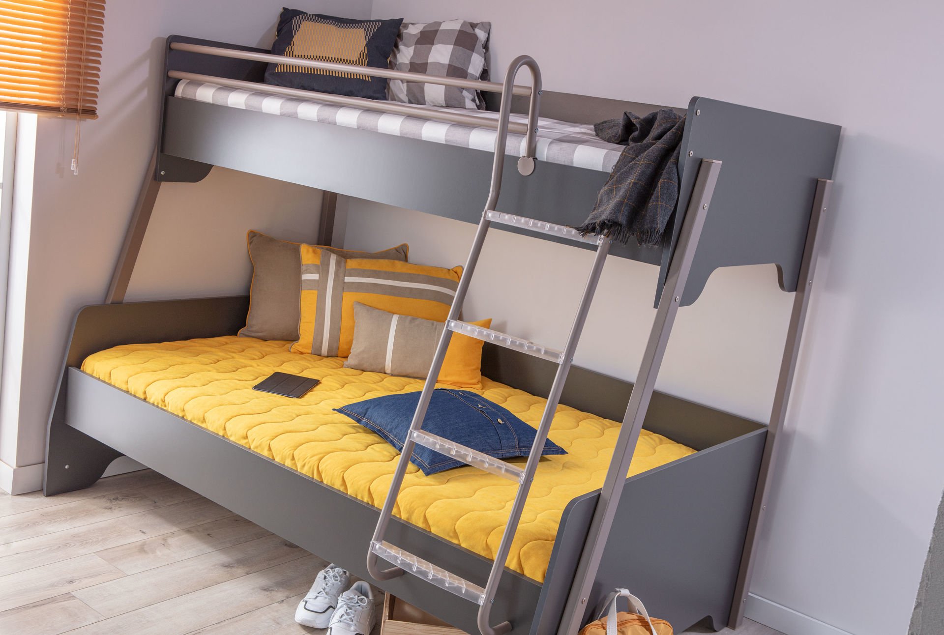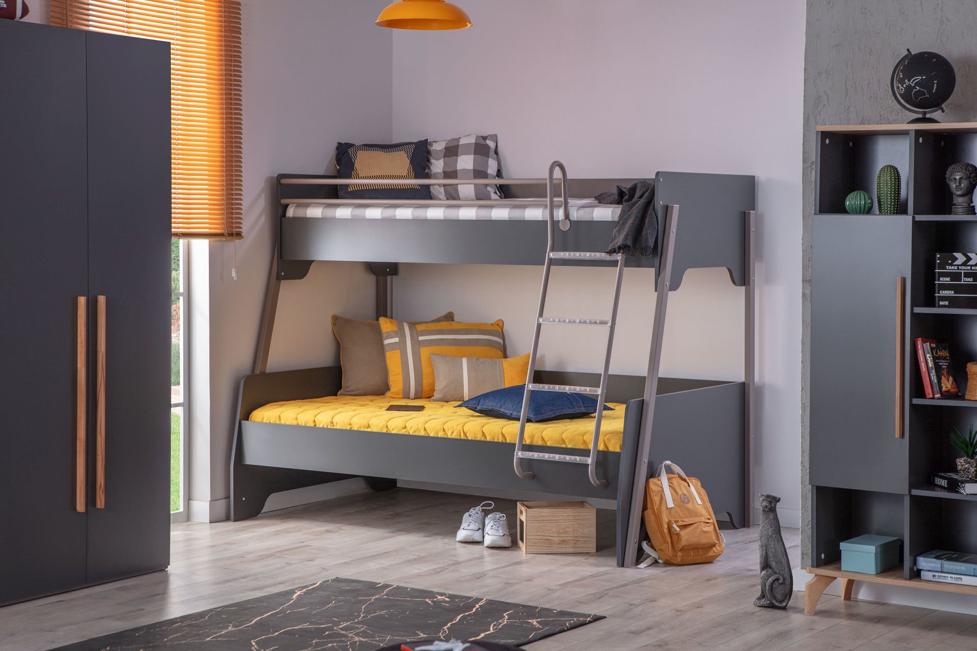 Aynı odayı paylaşan kardeşlerin rahatlığı için tasarlanan geniş ranza; üst yatak ölçüsü 90x200 cm, alt yatak ölçüsü 120x200 cm'dir.