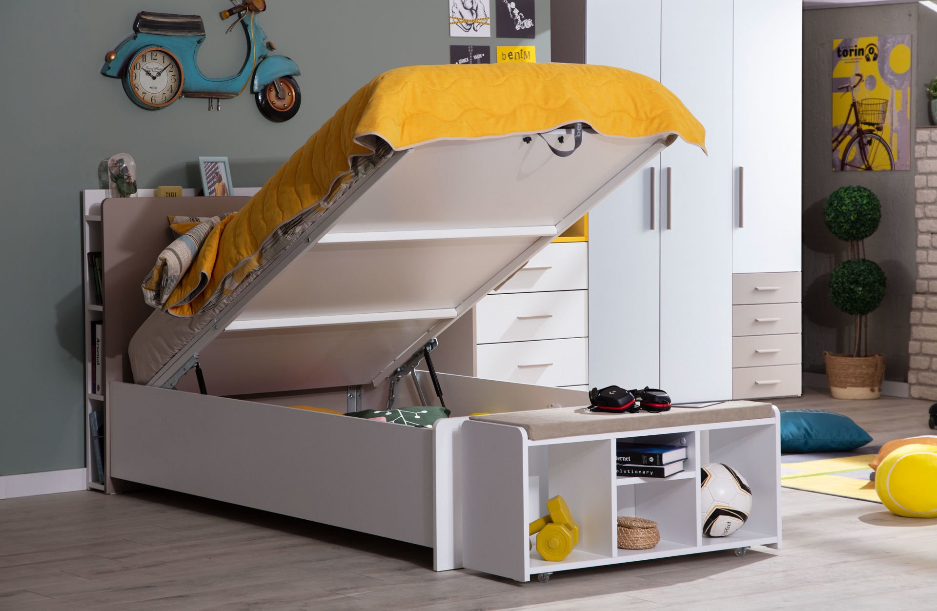 ·Karyola başucunun arkasında eşya koyabilmek için bölmeli hazneler bulunur.